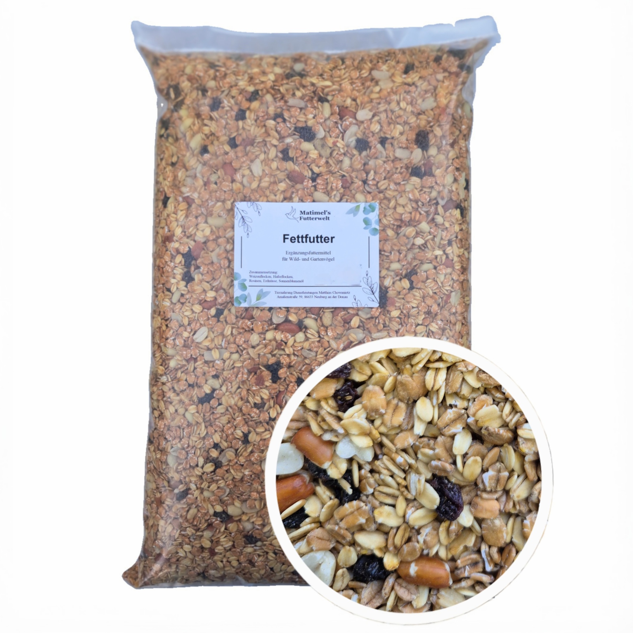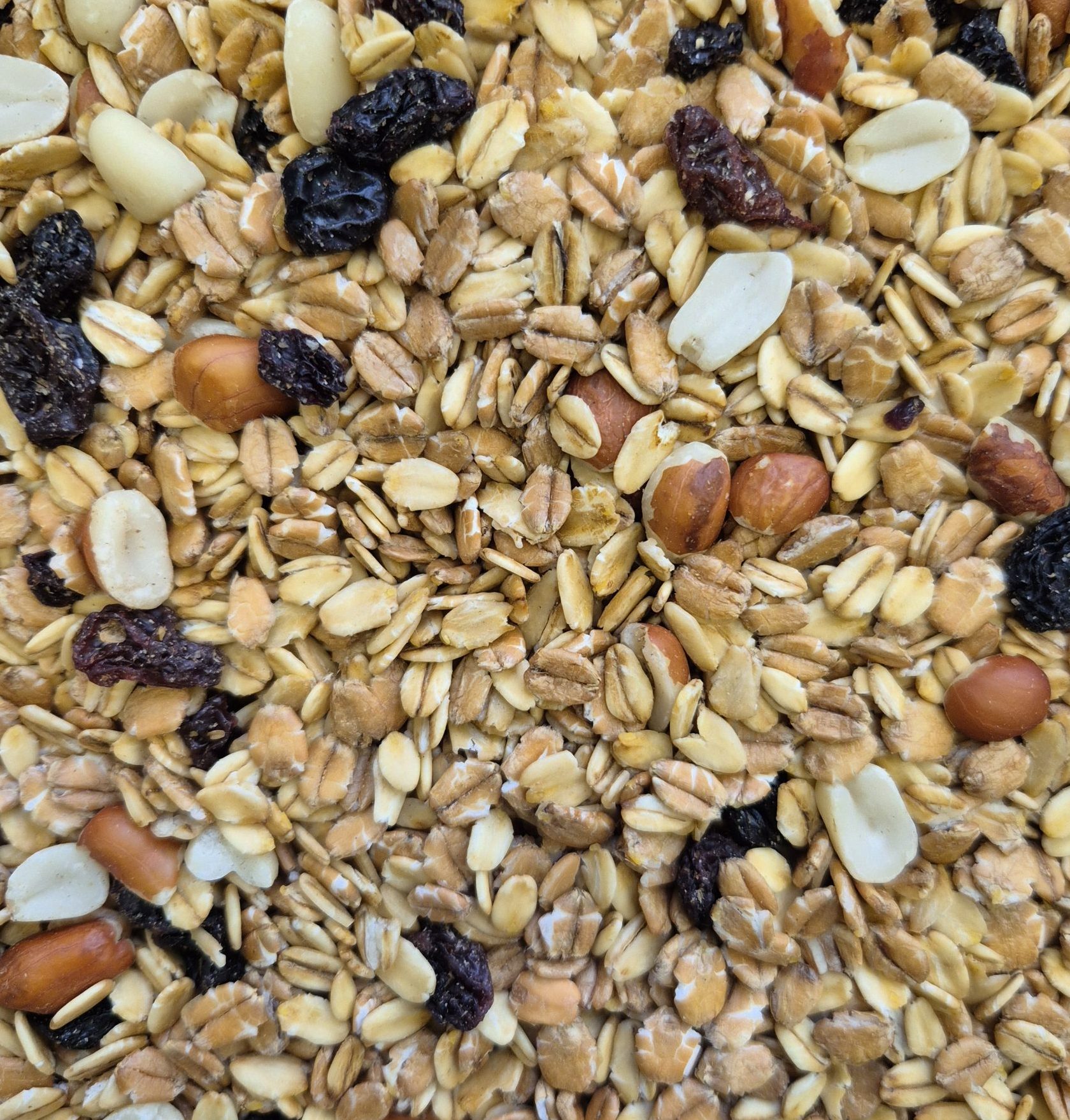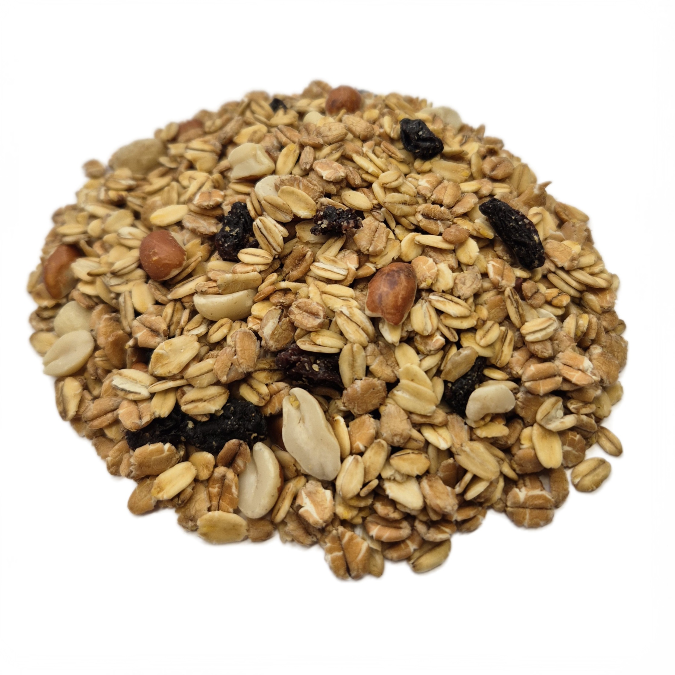 • Zusammensetzung: Haferflocken, Weizenflocken, Erdnüsse, Rosinen und Sonnenblumenöl