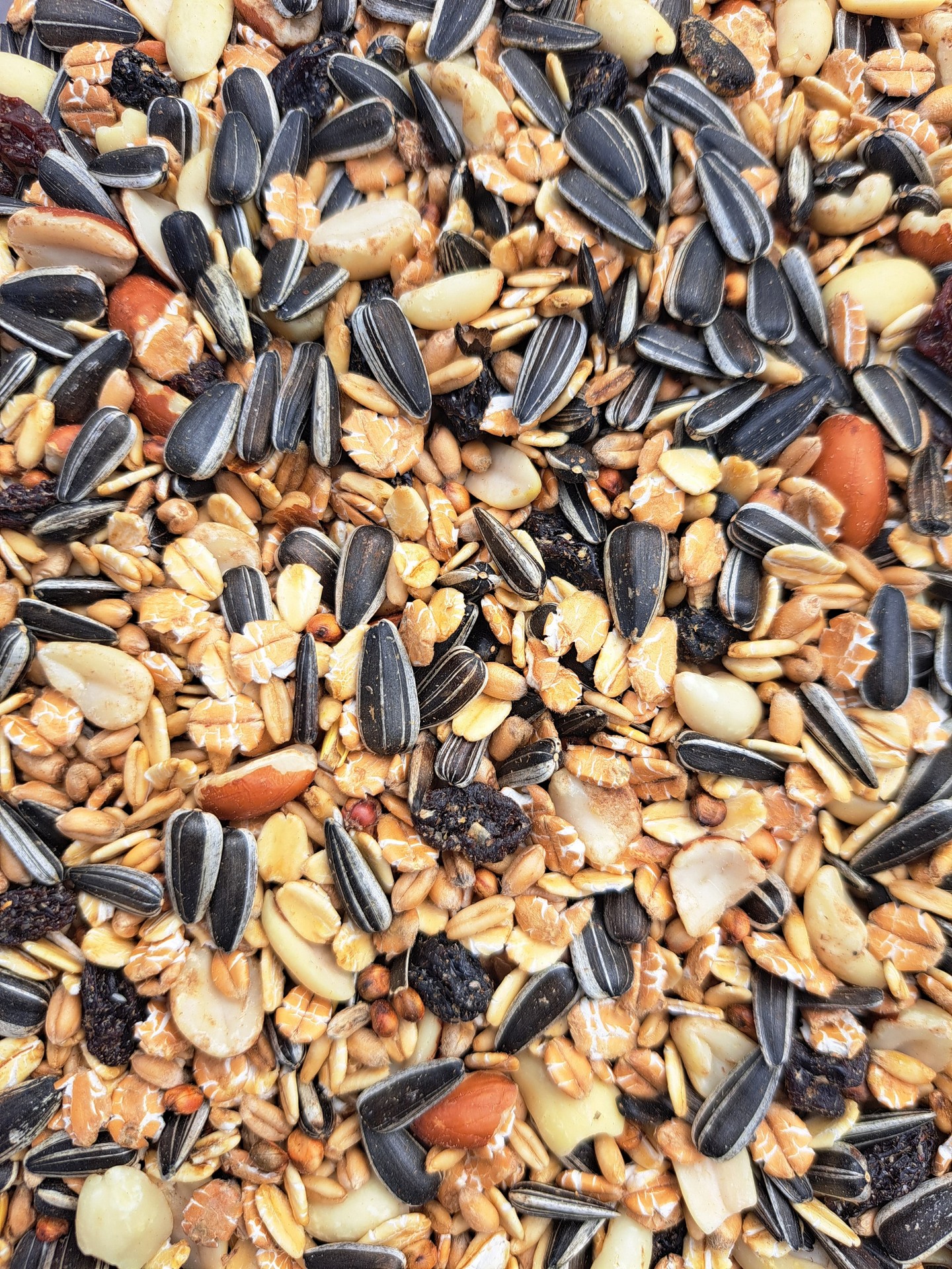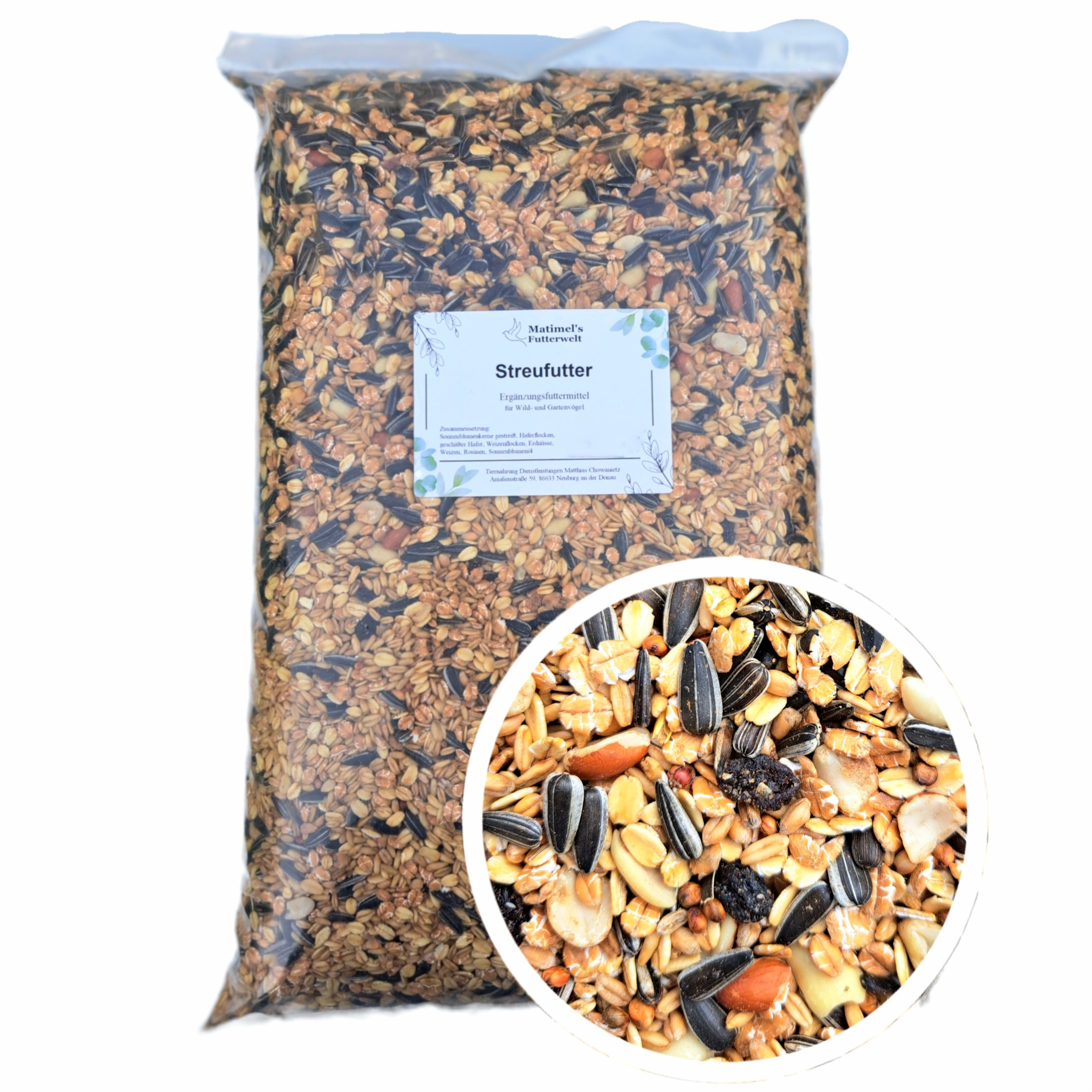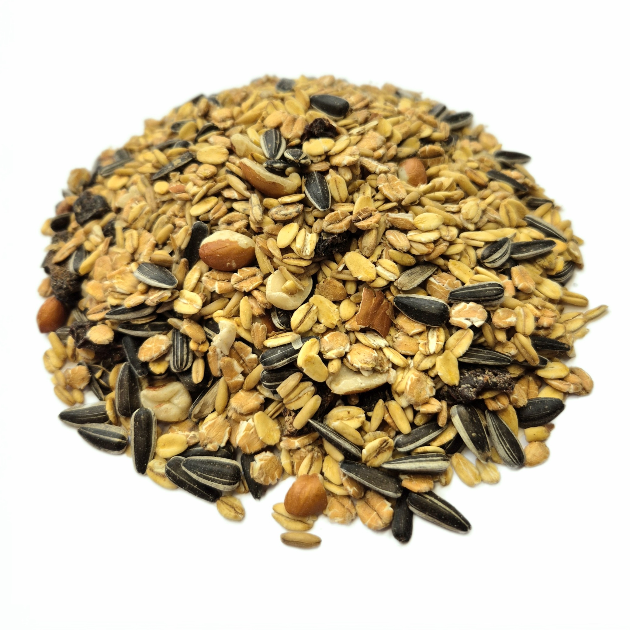 - Zusammensetzung: Haferflocken, geschälter Hafer, gestreifte Sonnenblumenkerne, Weizenflocken, Erdnüsse, Rosinen und Sonnenblumenöl